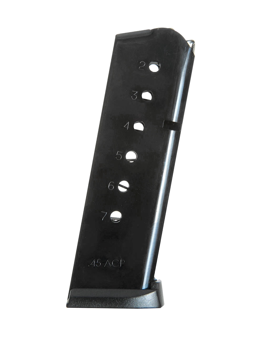 Cargador del calibre 45 ACP fabricado en acero con acabado pavonado con capacidad para 7 balas. Valido para pistolas Smith & Wesson 1911 Compact. Placa base de polímero, seguidor y resorte de acero. Accesorio de fábrica original Smith & Wesson.