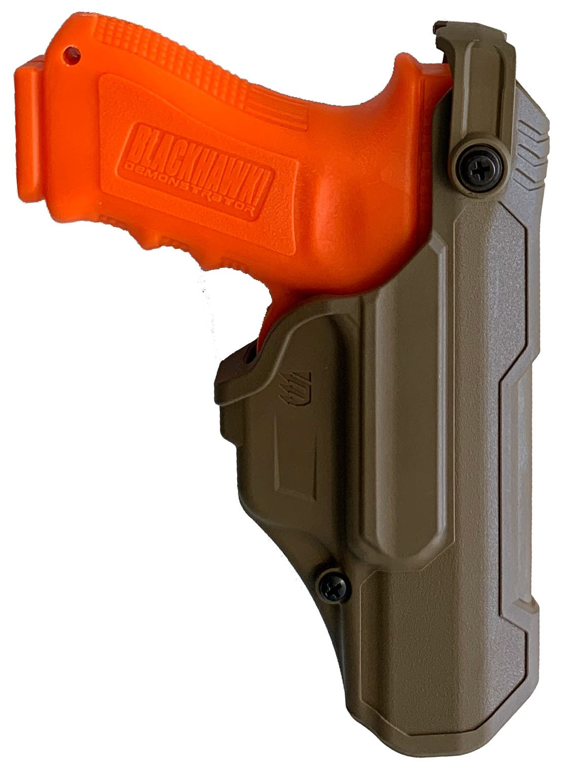 La funda T-Series, es similar a otras ofrecidas por Blackhawk, tiene varios tornillos Phillips en la parte posterior de la funda, lo que permite al usuario inclinarla o declinarla si así lo desea. Como cualquier otra funda con sistemas de retención, si alguien intenta robar su arma mientras está enfundada, no podrá. Si alguien intenta tirar del arma de fuego estando en la funda, los 3 niveles de mecanismo de seguridad la mantendrán dentro. Si alguien intenta salvajemente arrancar el arma de fuego y después de no poder hacerlo, comienzan a golpear o presionar el pulsador del pulgar, el arma de fuego tampoco logrará ser extraída.