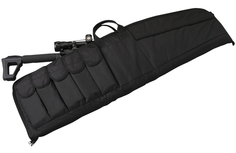 La funda larga tiene cinco compartimentos exteriores para cargadores.