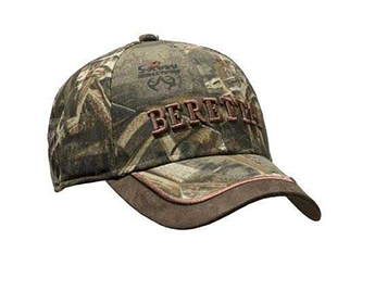 Gorra de comuflaje Beretta, con su logo bordado en el frontal con detalles de cuero