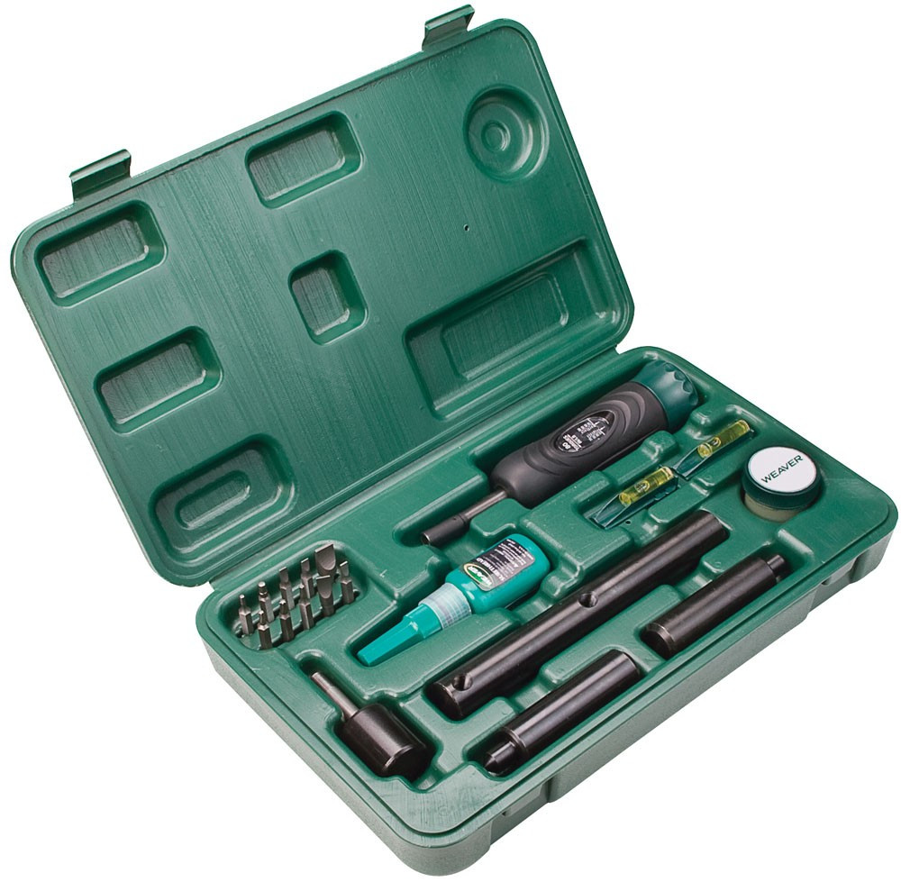 El kit deluxe de montaje de visores de Weaver garantiza un montaje precios de ópticas en su arma de fuego. Con estas herramientas de nivel profesional, puede intercambiar fácilmente la óptica y mantener el rendimiento y la estabilidad durante la vida útil de su visor. Las herramientas de lapeado de una pulgada y el compuesto están incluidos y se ajustan a la mayoría de montajes de las anillas, lo que hace que este completo kit sea ideal para la mayoría de las operaciones de montaje. También se incluye una llave dinamométrica ajustable de 1 a 80 libras/pulgada con punta magnetizada y una variedad de cabezales para un ajuste preciso, el adhesivo Weaver SureThread para evitar que se aflojen los tornillos y un juego de nivel modular magnético para una instalación precisa. El kit viene con un estuche de plástico duro y un DVD instructivo.