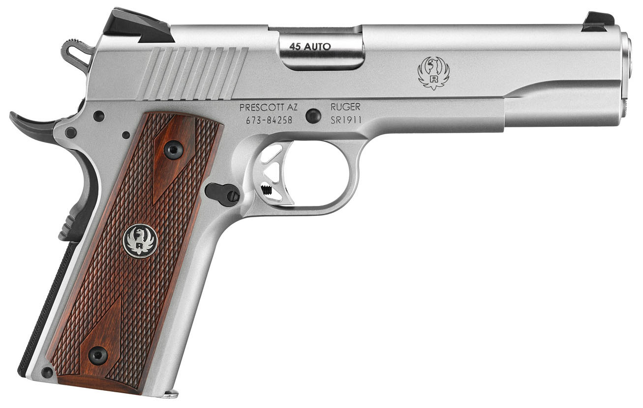 La pistola Ruger SR1911 de acción simple presenta armazón y corredera de acero inoxidable granallado y mecanizado con precisión por CNC para un ajuste preciso entre ambas partes. El cañón y el bushing de acero inoxidable se fabrican simultáneamente, a partir de la misma barra de calidad usada en artillería, para un mayor ajuste y una precisión mejorada. La corredera presenta aserraduras traseras y un sistema de mira de tres puntos compuesto de un alza trasera Novak® y una mira delantera estándar.