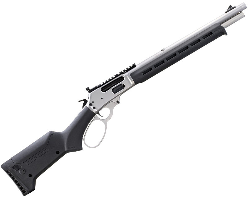 Basado en la misma plataforma que el Marlin 1895 SBL, el Marlin 1895 Trapper cuenta con un cañón más corto y maniobrable de 16.17″ (41 cm.) lo que le proporciona una longitud total de 33.25” (84,4 cm.). Viene en un acabado inoxidable satinado granallado para reducir el deslumbramiento. Está equipado con un cargador tubular que tiene capacidad para 5 balas, la culata sintética Magpul ELG y el gurdamanos con ranuras M-LOK® permiten montar una amplia variedad de accesorios. Utiliza un lazo sobredimensionado en la palanca de la casa Wild West Guns. Este tipo de lazo es ideal para poder operar el arma con guantes o para usuarios con manos muy grandes.